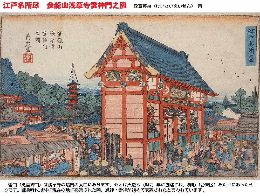 雷門の呼称は、江戸時代の川柳に初めて登場しますが、それ以前のいつの段階から呼ばれるようになったかは不明てす。知名度に関しては、雷門の名が書かれた提灯が1795年に初めて奉納されており、浮世絵の題材に用いられたことから、以降、日本各地へ浸透したものと考えられます。