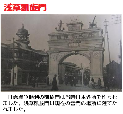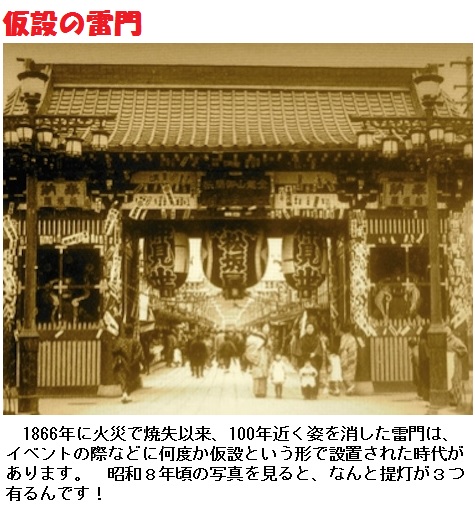 山門はしばしば火災により消失しており、江戸時代だけでも2度も建て替えられています。最後の火災は1866年(慶応元年12月14日であり、以後、100年近く恒久的な建築物としての山門は姿を消したそうです。明治年間から太平洋戦争後にかけては、さまざまな形態の仮設の雷門が登場したと伝えられています。いずれも博覧会の開催や戦勝記念など、その時々のイベント的な要素が強く、素材は鉄骨やコンクリートなどの構造もあったほか、大きさもさまざまであったといいます。1904年の日露戦争終結時には、凱旋門として雷門が建てられています。