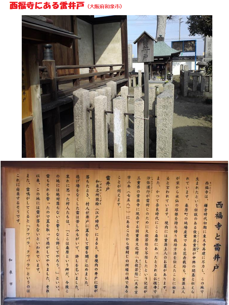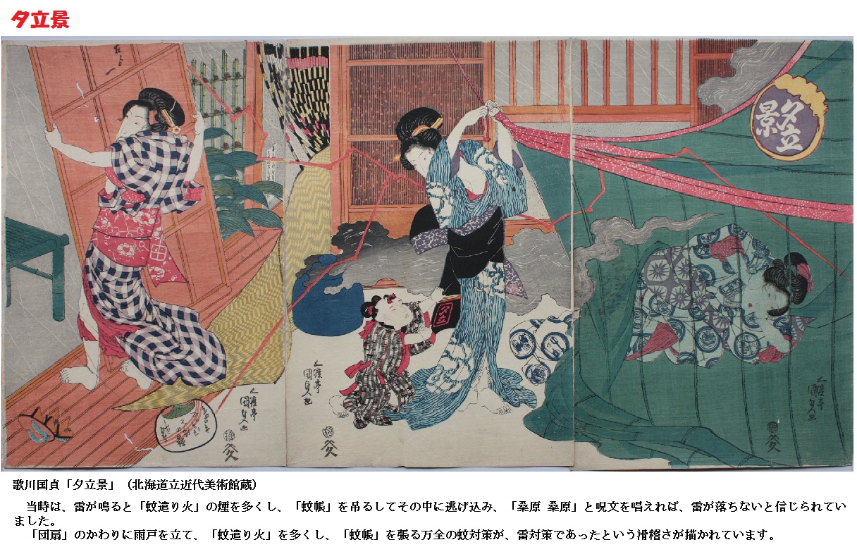 いやなことを避けるために言う「くわばらくわばら」という語は、元々落雷を除ける呪いの言葉でした。激しい雷の時に蚊帳のなかににげこんでこの語を唱える図も古くなりました。由来として伝えられている説は死して雷となった菅原道真の領地「桑原」には古来落雷した例がないという言い伝えによるものです。なお、「桑原」の所在は福岡説、大阪説、京都説などがあります。大阪の和泉市の西福寺には「桑原」に由来する雷井戸があるそうです。