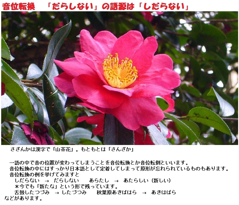 だらしないは、同じ意味の形容詞「しだらない」の音節順序を入れ替えた言葉。/「しだらない」の「しだら」は、「自堕落(じだらく)」が訛ったとする説や、「ふしだら」の「しだら」とする説があるが不明。/音節順序の入れ替えパターンはいくつか考えられるが、「だらしない」になった理由には、濁音で始まる言葉は悪い印象を与えるため(一般の和語で濁音が語頭にくるのは例外的で、悪い意味になることが多い)や、擬態語「ダラダラ」と近い印象になるためであろう。/また、「しだらない」から「だらしない」の音節順序が変わったのは、江戸時代に逆さ言葉が流行していたためとも言われるが、逆さ言葉であれば「らだしない」になる。/「だらしない」の語においては、「あらたし(い)」が「あたらし(い)」に変化したことに似た現象と考える方が自然である。