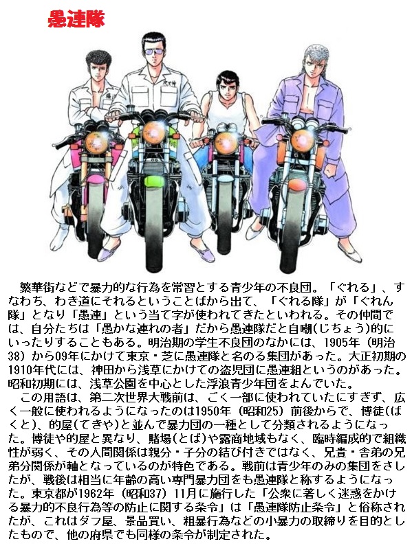 時に「ぐれはま」と訛り、さらに「ぐれ」と省略して用いられました。この「ぐれ」を動詞化たしのが、「ぐれる」です。予期したことと食い違う意から、脇道へそれる・堕落する・非行化するの意に転じました。ぐれた者たちの一隊に対して、「愚連隊」というもっともらしい当て字の語も生まれたのです。