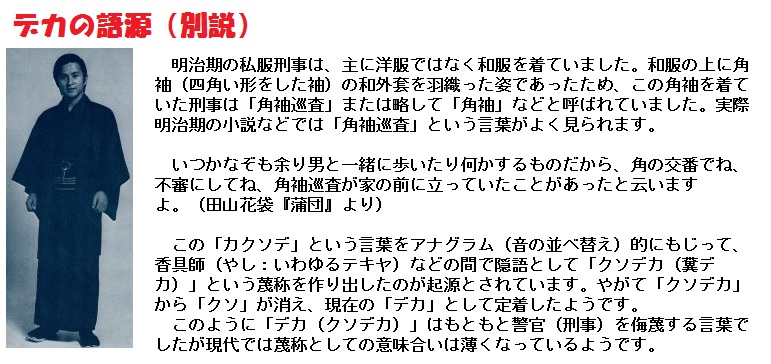刑事のことを「デカ」と呼ぶのはすっかり馴染んでしまっていますが、これは和服に語源があります。和服の中に「角袖」と呼ばれる機能的なキモノがありますが、この「カクソデ」の中の部分を略して「カデ」、それを引っくり返して「デカ」といったところから、すっかり一般化してしまったのだといいます。日本の警察は明治時代の初期、フランスの警察制度を参考にして創設されたもので、警察官の制服もフランス風のオシャレなものでした。これはこれで目立ってよかったのですが、隠密行動をとるには目立ちすぎました。そこで捜査に当たる刑事には私服を着用させることにしました。当時、私服といえば和服しかありません。で、動きのとりやすい「角袖」を着ることとなったのだといいます。そうした刑事は実際に「角袖巡査」とも呼んでいたそうで、そこから犯罪者仲間の中では「カクソデ」→「カデ」→「デカ」という隠語が作られたのです。ちなみに、巡査は黒い脚あてを付けていたため「足黒(アシクロ)」、立ち番をする制服巡査は「ポスト」と呼ばれていたそうです。