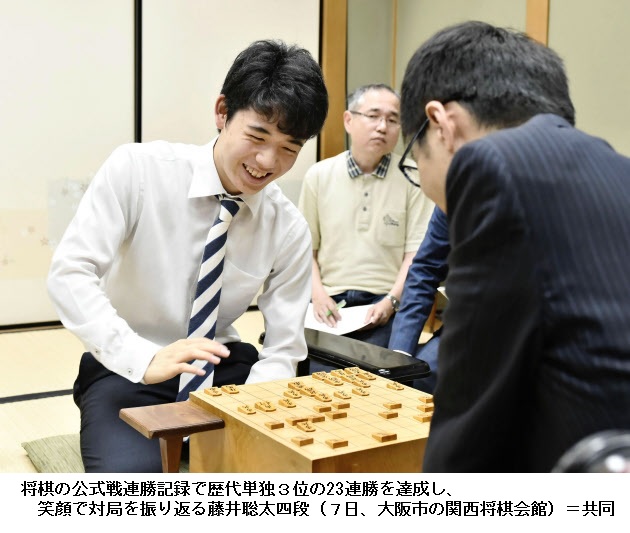 将棋の最年少プロ棋士、藤井聡太四段(14)は7日、大阪市の関西将棋会館で指された上州YAMADAチャレンジ杯トーナメントで、宮本広志五段(31)を破り、公式戦の連勝記録で羽生善治3冠(46)らを抜き、歴代単独3位の23連勝を達成した。