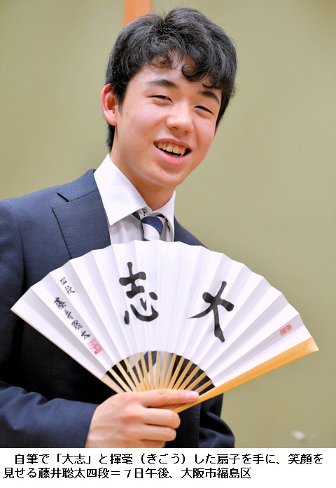 扇子には藤井四段が「大志」と揮毫(きごう)している。扇子を手に入れた兵庫県西宮市の無職井上秋彦さん(71)は「どんな書体が見てみたかった。文字はその人の人柄を表すっていうからね」と話した。