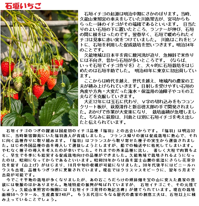 明治初年(1868)、開拓使がアメリカ産のイチゴの種苗を輸入し、ここから、わが国にイチゴ栽培が広まったといいます。明治27年(1894)、静岡県久能山の農家で、意外な事実が発見されました――庭の前の土留め用として積んだ玉石の前に、たまたま延びだしたイチゴの蔓が時期はずれの実を結んだのです。南向きの庭の玉石が太陽熱を吸収して、保温促成効果を表わしたのです。このことがヒントになり、石垣イチゴの栽培が始まったといいます。ところが、イチゴ作りが石垣栽培だけにとどまらず、さらに、これが温室栽培へとつながりました。イチゴが一年中、手にはいるようになったのです。雪のふる寒い時期のクリスマス・ケーキに、生のイチゴが添えられるようになりました。イチゴには、旬(しゅん)という言葉が不要となったのです。