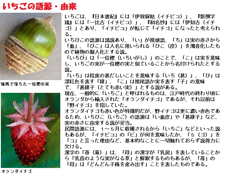 「いちご」の語源ははっきりしません。古くは『本草和名』(918年頃)や『倭名類聚抄』(934年頃)に「以知古」とあります。日本書紀には『伊致寐姑(いちびこ)』、新撰字鏡には『一比古(いちびこ)』とあり、これが古形であるようです。『本草和名』では、蓬虆の和名を「以知古」、覆盆子の和名を「加宇布利以知古」としており、近代にオランダイチゴが舶来するまでは「いちご」は野いちご全般を指していたようです。