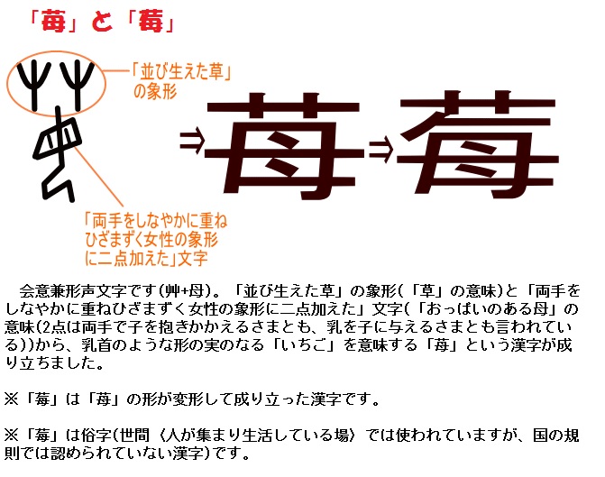 漢字には「苺」と「莓」があります。現代日本では「苺」、現代中国では「莓」を普通使うそうです。英語の strawberry(ストロベリー)は「藁 (straw) のベリー (berry)」と解釈できますが、そう呼ぶ理由ははっきりせず、「麦藁を敷いて育てた」「麦藁に包まれて売られていた」「匍匐枝が麦藁に似ている」という説があり、さらに、straw は藁ではなく、散らかす・一面を覆うを意味する strew の古語だという説もあります。
