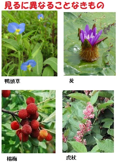 見るに異なることなきものの、文字に書きてことことしきもの。覆盆子(いちご)。鴨頭草(つゆくさ)。芡(みづぶき)。蜘蛛。胡桃(くるみ)。文章博士。得業生(とくごうのしょう)。皇太后宮権大夫(こうたいごうくうのごんのだいふ)。楊梅(やまもも)。虎杖(いたどり)は、まいて虎の杖と書きたるとか。杖なくともありぬべき顔つきを。