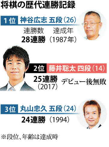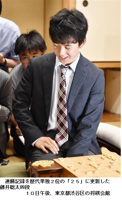 藤井四段、公式戦25連勝 過密日程なんの!歴代単独2位に ―― 将棋の史上最年少プロ棋士、藤井聡太四段(14)が10日、東京・将棋会館で第3期叡王(えいおう)戦の段位別予選に臨み、梶浦宏孝四段(21)、都成竜馬四段(27)に連勝。自らの持つデビューからの公式戦連勝記録を25に伸ばし、全体の連勝記録では丸山忠久九段(46)を抜き歴代単独2位となった。このまま勝ち続ければ21日の王将戦1次予選で、30年ぶりに神谷広志八段(56)の持つ最多記録28連勝に並ぶ。