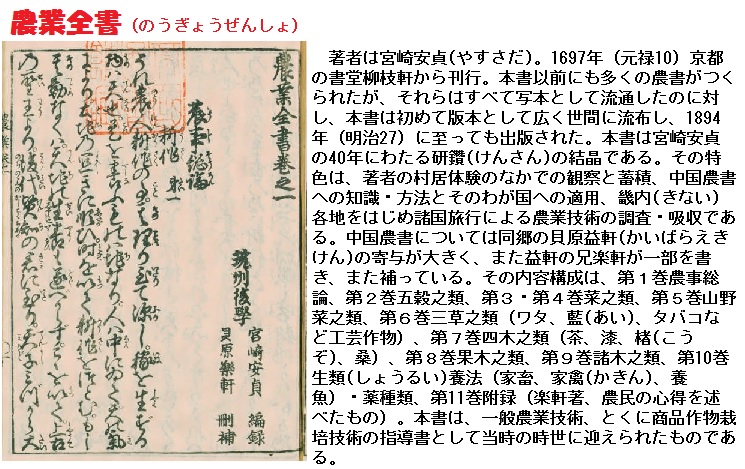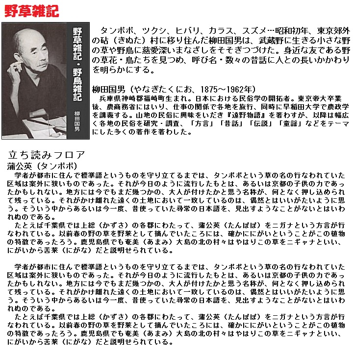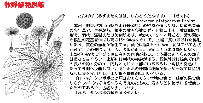 江戸時代初期、「東雅」より少し前に書かれた本「農業全書」(宮崎安貞、1697年)に、「たんほほは秋苗を生じ、四月に花さく。黄白二色あり。花は菊に似て、あひらしき物なり。夏 種を取りき、正月蒔まきて苗にして、移しうゆるもよし、山野にをのづから生るを苗にするもよし。味少し苦甘く料理に用ゆる時、葉をとりて茹ゆがき、ひたし物、あへ物、汁などに料理してよし。これを食すれば、大用の秘結をよく治すなり。圃の廻り、菜園の端々、多少によらず、かならずうゆべし。」とあり、タンポポについての農事作業のほか、料理の方法や食べ方を記しています。狭いところでも、空き地にはタンポポを植えなさいと勧めています、すごい力の入れようであります。