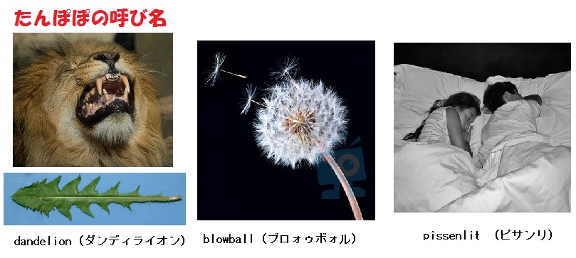 英語名のダンディライオン(dandelion)はフランス語で「ライオンの歯」を意味するダン=ド=リオン(dent-de-lion)に由来し、これはギザギザした葉がライオンの牙を連想させることによるものです。また綿毛の球状の部分をさしblowballともいいます。現代のフランス語ではピサンリ(pissenlit)というが、piss-en-litで「ベッドの中のおしっこ」という意味です。これはタンポポに利尿作用があると考えられているためであるといいます。