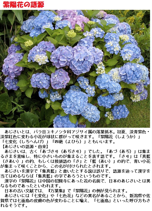 アジサイの語源ははっきりしませんが、最古の和歌集『万葉集』では「味狭藍」「安治佐為」、平安時代の辞典『和名類聚抄』では「阿豆佐為」の字をあてて書かれています。もっとも有力とされているのは、「藍色が集まったもの」を意味する「あづさい(集真藍)」がなまったものとする説です。そのほか、「味」は評価を、「狭藍」は花の色を示すという谷川士清の説、「集まって咲くもの」とする山本章夫の説(『万葉古今動植物正名』)、「厚咲き」が転じたものであるという貝原益軒の説があります。花の色がよく変わることから、「七変化」「八仙花」とも呼ばれます。