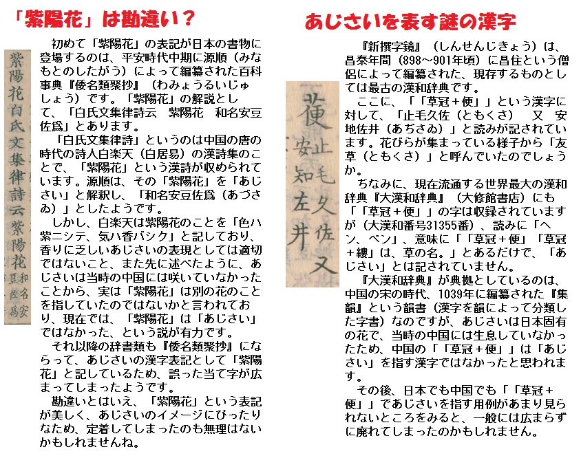 日本語で漢字表記に用いられる「紫陽花」は、唐の詩人白居易が別の花、おそらくライラックに付けた名で、平安時代の学者源順がこの漢字をあてたことから誤って広まったといわれています。