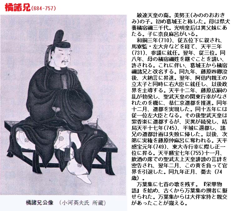 いっぽう諸兄の歌では、八重咲き(厚咲き)のあじさいをめでたい花として取り上げています。当時のあじさいは、現在見られるような大手鞠でなく、花(実は萼ですが)の数が少ない日本原産のガクアジサイであろうと言われていますが、貴族の庭園などには厚咲きのものが植えられていたことがわかります。それなりに古来賞美されてきたようです。天平勝宝七(755)年五月十一日に、右大弁丹比真人国人の家で、左大臣橘諸兄(684~757年)を招いて宴を催したとき、諸兄が主人国人を祝って詠んだ歌です。あじさいの豊かな花のように、またつぎつぎ色を変えて長く咲き誇るようにと国人を祝って詠んでいます。作者、橘宿禰諸兄(たちばなのすくねもろえ)はもともと葛城王(かつらぎのおおきみ)と称していましたが、後に母方の橘宿禰を継ぐことを請い、許され改名します。天平9(737)年の疫病により四子が次々と亡くなると、大納言に昇進します。以後、大きく政治に携わっていきますが、天平17(745)年の遷都計画が失敗に終わりますと、次第に実権を藤原仲麻呂にうばわれてゆきます。この歌を詠んだ翌年二月、宴席で上皇を誹謗したと、側近に密告され、この責を負って諸兄は政界を離れます。