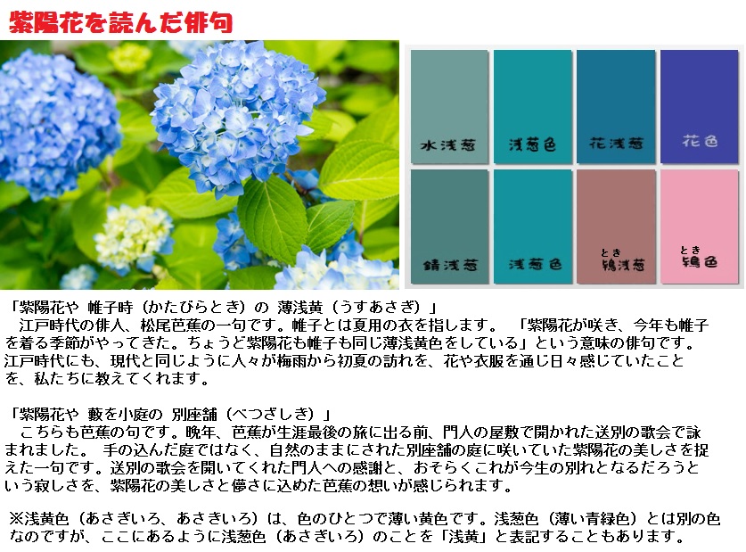 あじさいの歌は万葉集に二首ありますが、平安時代にはほとんど見えなくなります。古今から新古今までの八代集に、あじさいを詠んだ歌は一首も採られていません。梅雨の季節に欠かせない風物詩と思える紫陽花が、古典和歌ではこれほど不人気なのも、不思議なことです。