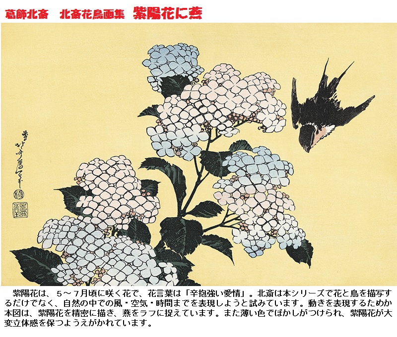 また、紫陽花は画壇でもしばし描かれています。葛飾北斎も「あじさいに燕」という絵を描いています。濃淡で色づけされた紫陽花が印象的な作品です。