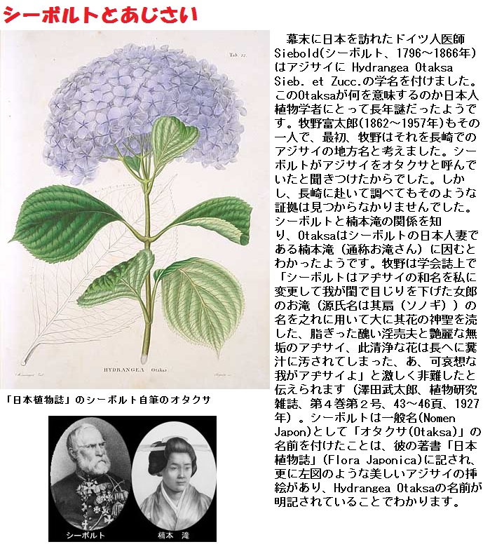 シーボルトは、日本の様々な植物を掲載した『日本植物誌』を刊行します。そこで彼は、長崎の中国寺で採取したという空色の紫陽花を「Hydrangea otaksa」(ハイドランゼア オタクサ)と名づけて紹介したのです。「オタクサ」とは、「お滝さん」のこと。ドイツ人シーボルトが、妻の名を呼ぶ時の発音そのままを花の名にしたのでした。