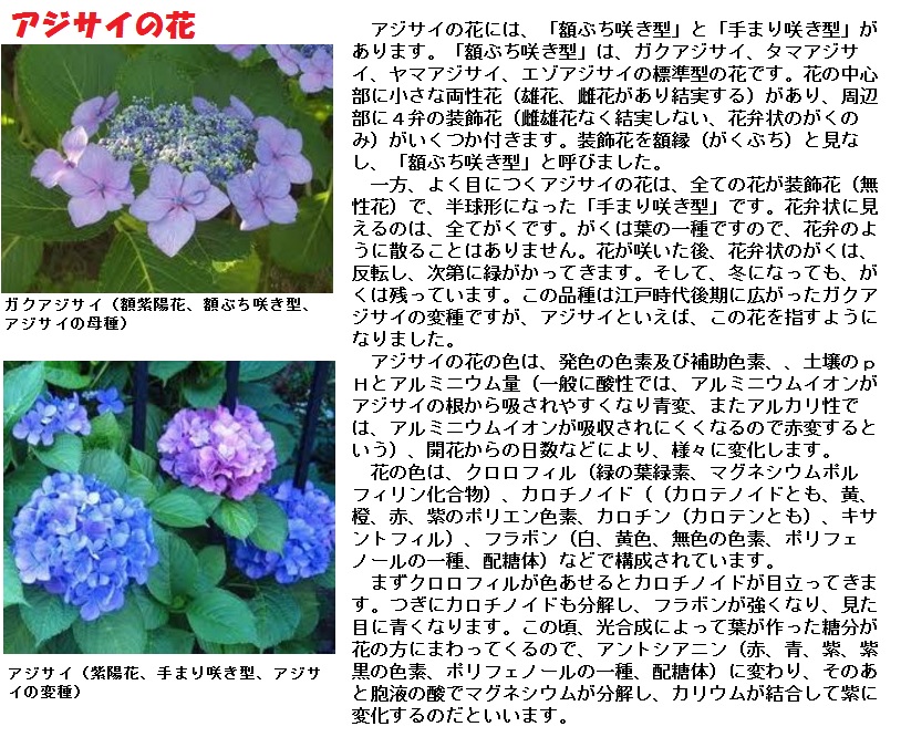 アジサイは6月から7月にかけて開花し、白、青、紫または赤色の萼(がく)が大きく発達した装飾花をもちます。ガクアジサイではこれが花序の周辺部を縁取るように並び、園芸では「額咲き」と呼ばれます。ガクアジサイから変化した、花序が球形ですべて装飾花となったアジサイは「手まり咲き」と呼ばれます。日本、ヨーロッパ、アメリカなどで観賞用に広く栽培され、多くの品種が作り出されています。原産地は日本で、ヨーロッパで品種改良されたものはセイヨウアジサイ と呼ばれています。