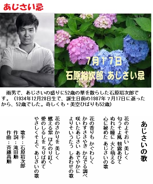 生前に「あじさいの歌」を歌ったこととアジサイが好きだったことにより7月17日の石原裕次郎忌を「あじさい忌」というのだそうです。