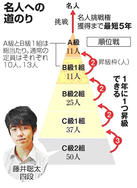 藤井四段がまず参加するのが、最も人数が多い一番下のC級2組。抽選で決まった10人の相手と1年間かけて戦い、50人(今期)の中で上位3位以内の成績をあげればC級1組に昇級できる。毎年昇級を続ければ、A級に4年で到達できる。そこで1年戦い、1位となれば名人に挑戦できる。