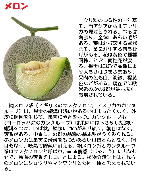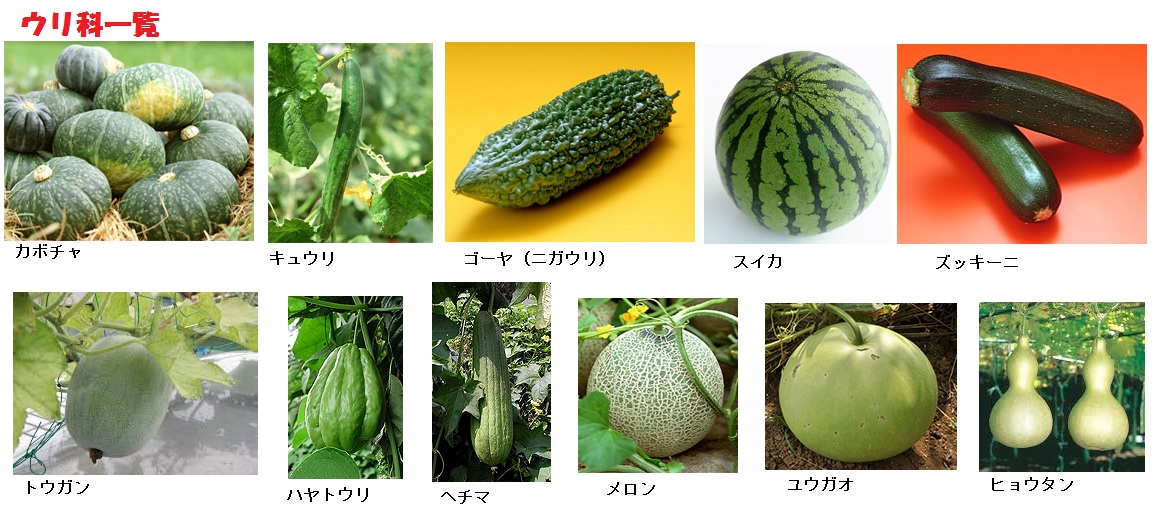 瓜の仲間には、だれもが知っているきゅうり(胡瓜)、すいか(西瓜)、なんきん(南瓜)などのほか、とうがん(冬瓜)、にがうり、まくわうり、かんぴょうの材料である夕顔、奈良漬の材料になる白うりなど多くの種類があり、いずれも夏の代表的な食べ物となっています。ふつうは食用にしない瓢箪や糸瓜も瓜の仲間です。中でも、古くは「まくわうり」を特に瓜と呼んでいたといいます。
