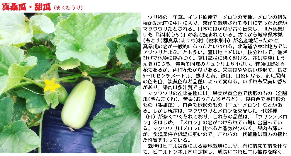 今の若い人の中には、まくわうりを知らない人もいるかもしれません。これはメロンのような甘い瓜で、爺たちが子供のころには夏に欠かせない果物でした。そのころは、現在のようにコンビニや自動販売機もなく、ジュースや清涼飲料水は特別な日にしか口にすることができませんでしたが、夏になると、西瓜やまくわうりが必ず井戸の中に漬けてあったり、氷の冷蔵庫に入れて冷やされていました。かぶと虫や蝉を採るために山の中を駆けずり回った後は、西瓜やまくわうりにむしゃぶりついて、咽喉の渇きを潤したものです。現在メジャーな「夕張メロン」や「マスクメロン」も、我々には、まくわうりの仲間としか考えられないのです。