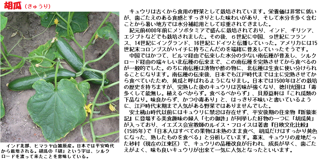 その後、インドやヨーロッパから中国に胡麻(ごま)や胡桃(くるみ)などと一緒に伝来しました。ちなみに胡瓜と呼ばれるのは、中国からみた西方民族の事を『胡』と呼び、そこからきた瓜なので『胡瓜』と呼ばれるようになったようです。