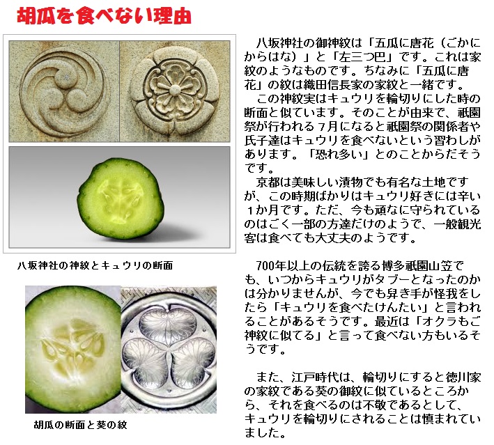 日本での胡瓜の本格的な普及は17世紀以降になってからで、それほどまで普及が遅くなった要因として、日本の祇園信仰による所の、京都八坂神社の紋が胡瓜の切り口に似ていることで、禁忌作物にされていたことや、葵の御紋に似ているので武士たちが恐れ多いと口にしなかったことなどがありますが、一番有力なのは、当時のきゅうりは非常に苦かったことがあげられるでしょう。