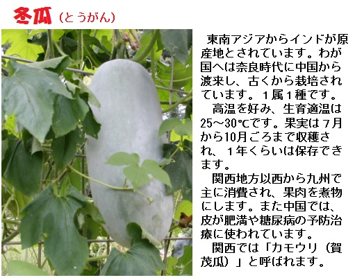 さて、瓜の仲間は夏の食べ物だと言いましたが、中には冬でも食べるものがあります。例えば、冬瓜は、丸のまま保管すると冬まで使えるので冬瓜という名がついたといわれるほど、長期保存が可能な野菜でした。また、カンボジアから伝わったという南瓜も、「冬至かぼちゃに年を取らせるな」ともいうように、冬まで保存が出来、貴重な栄養源でした。 冬瓜の原産地は東南アジアで、ジャワ島の平地には現在も自生しているそうです。中国には3世紀に伝わり、その後中国から日本へ伝わったとされています。野菜として利用するのは主に日本と中国で、特に中国では様々な料理に用いられています。皮にできるろう質の粉を雪に見立てて冬瓜と呼ぶという説もありますが、この粉が全体に均一についていて、しわがなく、ずっしり重い物を選ぶようにします。いくら保存性がよいとはいえ、切ったものは保存が利かないので、家庭では小さくカットされたものを購入するとよいでしょう。 冬瓜はほとんどが水分なので、昔からの民間療法では、身体を冷やし、利尿効果に優れているといわれ、解熱や毒消しにもよいとされてきました。最近では、低カロリーのダイエット食としても注目されています 。