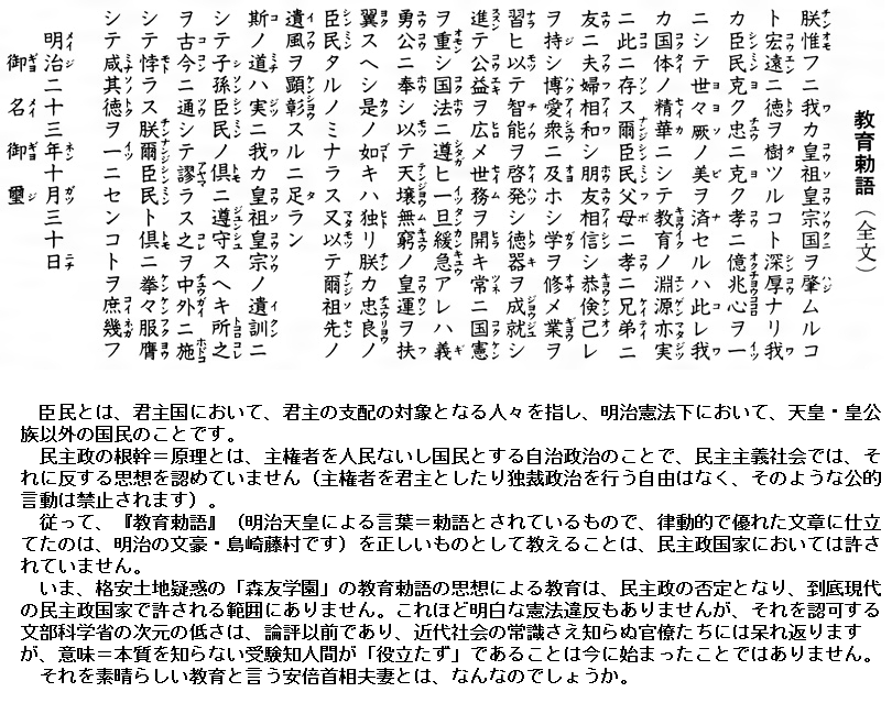 【教育勅語】 正式名は「教育ニ関スル勅語」で、大日本帝国憲法(明治憲法)で事実上の主権者だった明治天皇が1890年に発布した。国民の守るべき徳目が示され、戦時中は国家総動員体制の正当化に利用されたと指摘される。戦後の1948年、衆参両院は国民の基本的人権を損なうなどとして排除・失効を決議。森友学園の問題では、運営する幼稚園が園児に暗唱させていたことが疑問視された。 (2017/4/16 07:00神戸新聞NEXT)