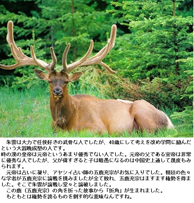 朱雲、字は游(ゆう)、魯(山東省)に生まれ、平陵(陝西省咸陽県西北)に移った。若い頃、侠客とつきあい、侠客の手を借りて仇討ちをしたことがある。身長八尺余り、風采頗る堂々としている。勇気と腕力で有名であった。 四十になってから、心を改め博士の白子友について『易』を学び、また前将軍(全軍の将軍)蕭望之(しょうぼうし)について『論語』を習った。『易』『論語』とも師匠の奥許しを受けた。小さい俗事にこだわらず、親分肌である。世間はそれで朱雲を尊敬した。――平凡社、中国古典文学大系13 漢書・五漢書・三国志列伝選より――