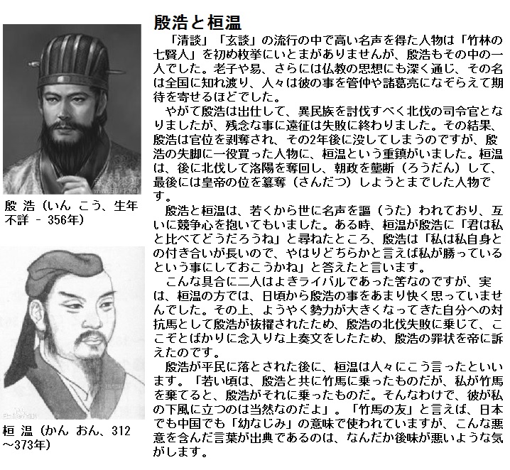 殷浩が位を平民に落とされてから、桓温が人々に言った。「幼いとき、殷浩と竹馬に乗ったものだが、私が竹馬を棄てると、殷浩がそれを拾って乗ったものだ。もとから彼は、私の下風に立つべき人物なのだよ