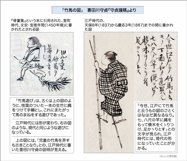 「たけうま」に関して付け加えておくと、 昔のたけうまは、今のものとは、少し違っていたようです。竹を馬のようにして、遊んだのが始まりのようです。