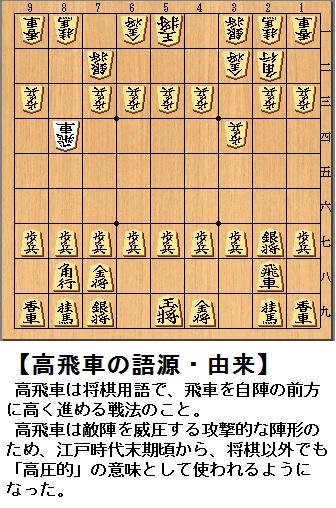 高飛車【たかびしゃ】 一般的な意味:高圧的な態度または人 将棋での意味:飛車を高い位置で戦うこと