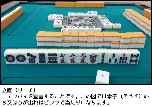 立直【りーち】 一般的な意味:何かが揃うまで後一つの状況 麻雀での意味:テンパイを他のプレーヤーに宣言すること、またその役