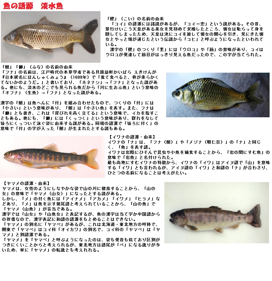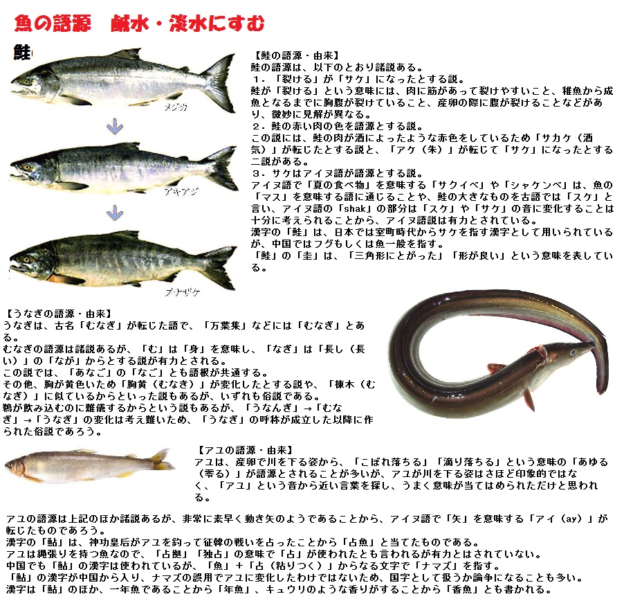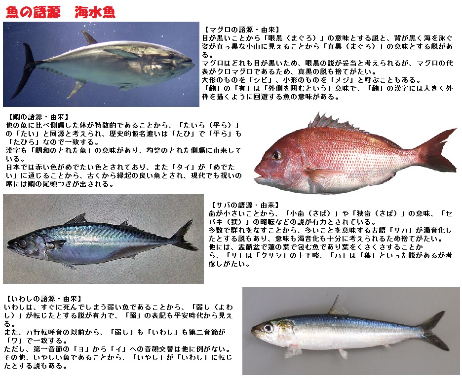 〔魚は、元々「酒菜(さかな)」と書き、「酒のつまみ」を意味していた。奈良時代から室町時代にかけて、「さかな」と呼ばれていたものは、「塩」「スモモ」「味噌」などで、江戸時代以降、酒の肴に魚肉が多く使われたため、魚肉を「さかな」と呼ぶようになった。本来、魚類全般は「いを」と言い、「いを」から「うを」、「うを」から「うお」へと変化した。しかし、「うお」では不安定な母音の連続になるため、海や川で泳いでいる魚類も「さかな」と呼ぶようになった。〕とあります。