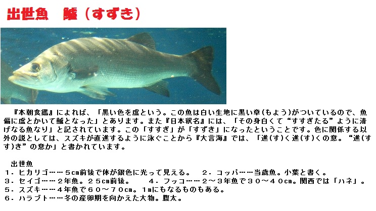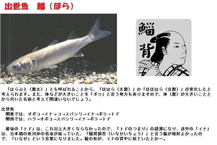 望んでもなかなか出来ない出世ではありますが、魚の中には出世するものがあります。鯔(ぼら)は「ハク」から最後は「トド」にまで成長します。ここから出たのが、「とどのつまり」という語だということです。鰤(ぶり)は関東と関西では異なる出世ぶりで最後に鰤になります。