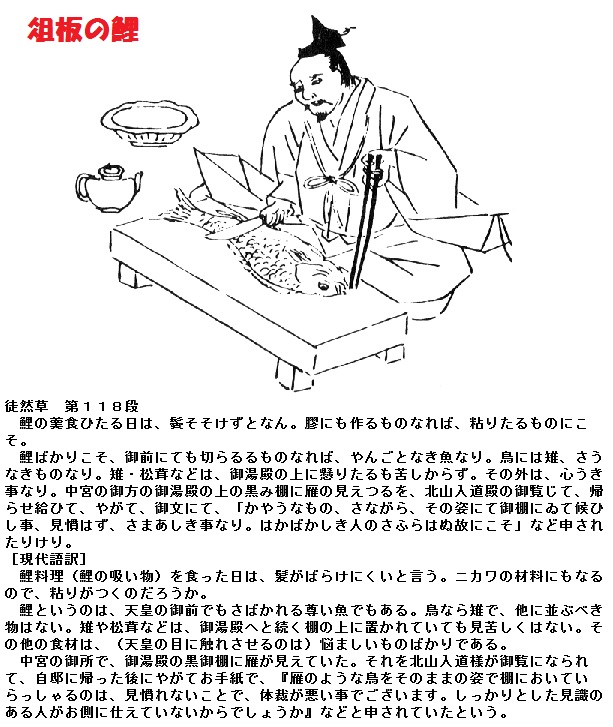 「登竜門」の故事から出世の象徴ともされる鯉は、古典ではすでに『風土記』に登場するといいます。『徒然草』にも「御前にてもきらるるもの」とあり、古くから珍重されていました。