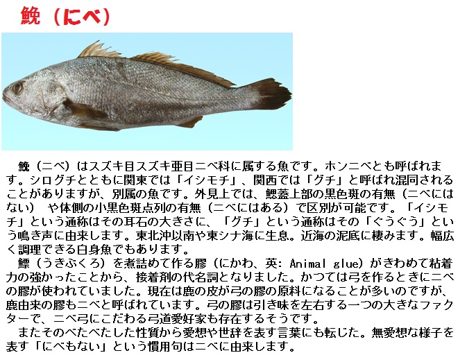 頼みごとをしても全く聞いてくれない、手を変え品を変えて掛け合ってみても、取り合ってもらえない、こんな対応を「にべもない」と言います。元来「にべ」は魚の名で「鮸」と書きます。その鰾(うきぶくろ)から接着剤の「鮸膠(にべにかわ)」を製造しました。たしかに、相手に粘着力がなくては、取りつくしまもございませんわ。