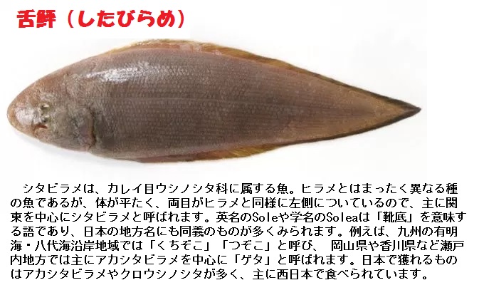 英語のsole(ソール)は元来靴底を意味する単語ですが、形が似ているところから魚の舌鮃(したびらめ)の別称にもなっているとのことです。日本語の「靴底」もシタビラメを指す言葉として使われているそうです。どちらも近代以前からつかわれているようほうのようです。人間の発想は世界どこでも似ているということでしょうか。