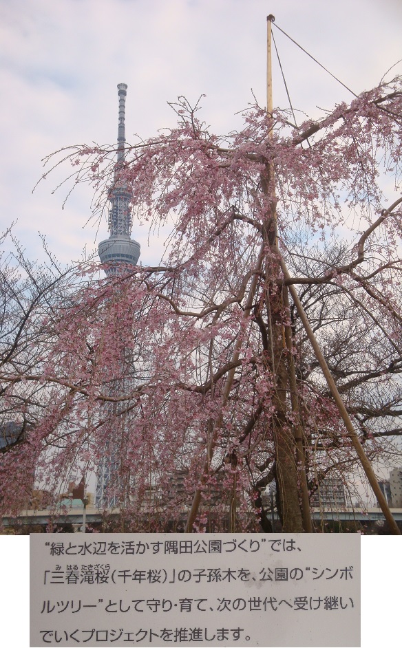 昨日は買い物の前に隅田公園を歩いてみました。築山には枝垂桜が見事に花をつけていました。「三春滝桜」というのだそうです。