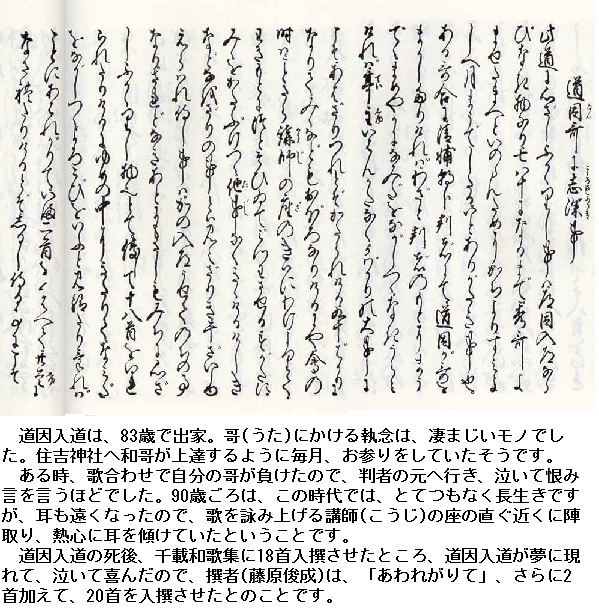 この道に心ざし深かりしことは、道因入道並びなき者なり。七、八十になるまで、「秀歌よませ給へ」と祈らんために、かちより住吉へ月詣でしたる、いとありがたき事なり。