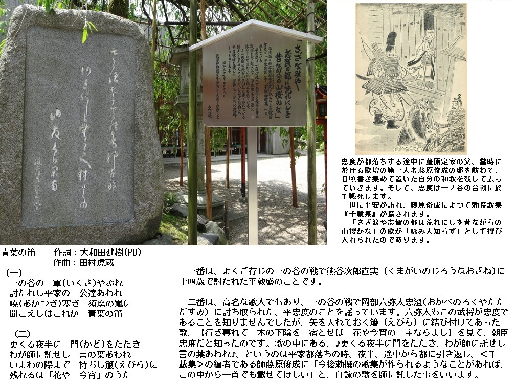 そののち、世静まつて千載集を撰ぜられけるに、忠度のありしありさま言ひおきし言の葉、今さら思ひ出でてあはれなりければ、かの巻物のうちに、さりぬべき歌いくらもありけれども、勅勘の人なれば、名字をばあらはされず、「故郷の花」といふ題にて詠まれたりける歌一首ぞ、「詠み人知らず」と入れられける。