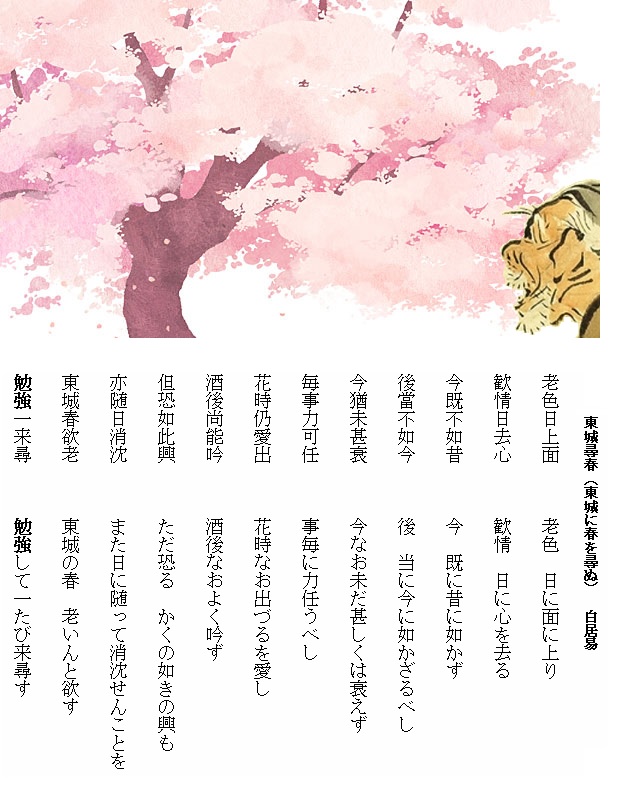 花が咲けば観に出掛けたくもあり 酒を飲めば 詩を吟じる事もできる この興味もやがて消滅するであろうと思うと実に心細い、東城の春も 老いるであろうと思って 勉強して観に来たわけだ。