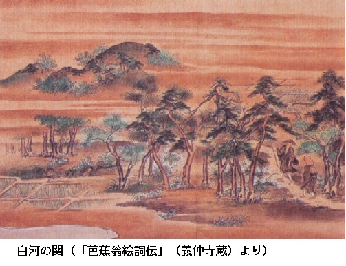この関所は、勿来・鼠の関と共に三関の一つで、古来、多くの歌人の心を魅了してきた。能因法師の歌「都をば霞とゝもに出しかど秋風ぞふくしら河のせき」からは秋風が聞こえるようだ。左大弁親宗の「もみぢ葉の皆くれなゐに散しけば名のみ成けり白川の関」からは秋の紅葉を連想し、源三位頼政は「都にはまだ青葉にて見しかども紅葉ちりしくしらかはのせき」と詠んだが、眼前の青葉の梢もまたすばらしい。藤原季通朝臣の歌「見て過る人しなければうの花の咲る垣根やしら河の関」に出てくる卯の花だけでなく、茨の花も咲き加わって、久我通光の歌「しらかはのせきの秋とはきゝしかどはつ雪わくる山のべの道」に出てくる雪よりも白く見える。竹田大夫国行は能因法師の歌に敬意を表し、この関を越えるにあたって衣服を改めたと、藤原清輔の『袋草紙』に書いてあるという。