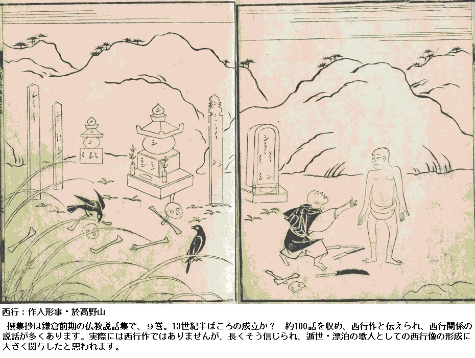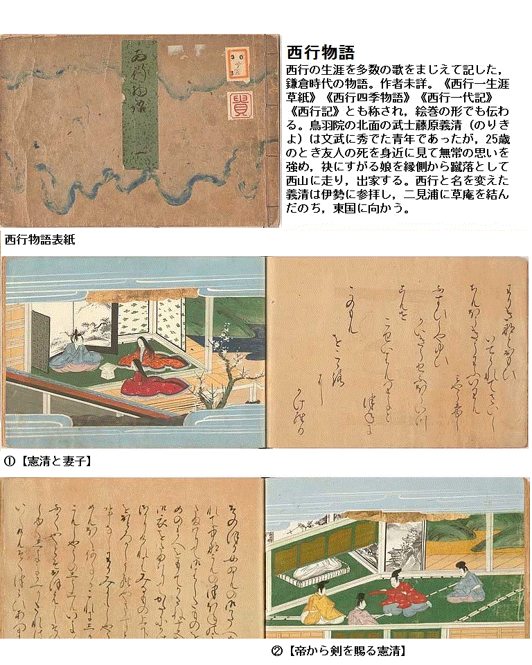 鳥羽院の御時、左兵衛尉藤原憲清という者がおりました。後に出家して西行と呼ばれたのがこの人です。憲清は、武士の家の生まれですから、武芸はもちろんですが、詩歌管絃の道にも優れた才能を示しました。また、和歌の道にかけては、業平や貫之などの古の歌仙にひけをとりません。帝も憲清をたいそう寵愛し、宮中での遊びのおりには、まず憲清を召し、側をはなしませんでした。