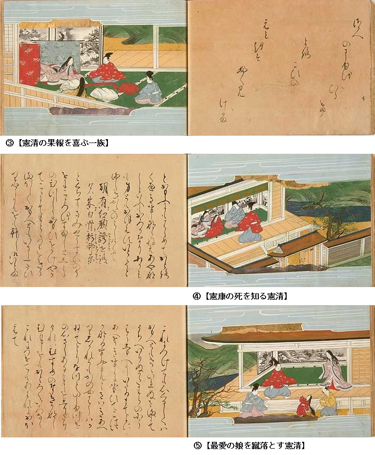 ① 【憲清と妻子】ところが、憲清は、表面上は真面目に朝廷にお仕えしていましたが、心の底では、この世の無常を観じ、出家を望んでいました。(この世の栄耀栄華など、はかないもの。それに縛られて、死んでから地獄で苦を受けるとはあわれなこと。早く出家してしまいたいものだ。とはいえ帝の御恩や妻子のことを考えると……。)