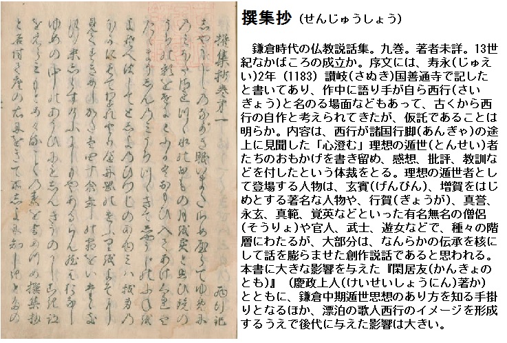 千載集撰ばれし事は、かの入道失せてのちの事なり。亡き跡にも、さしも道に心ざし深かりし者なればとて、優(いう)して十八首を入れられたりければ、夢の中に来て涙を落としつつ、よろこびを云ふと見給ひたりければ、ことにあはれがりて、今二首を加へて二十首になされにけるとぞ。しかるべかりける事にこそ。