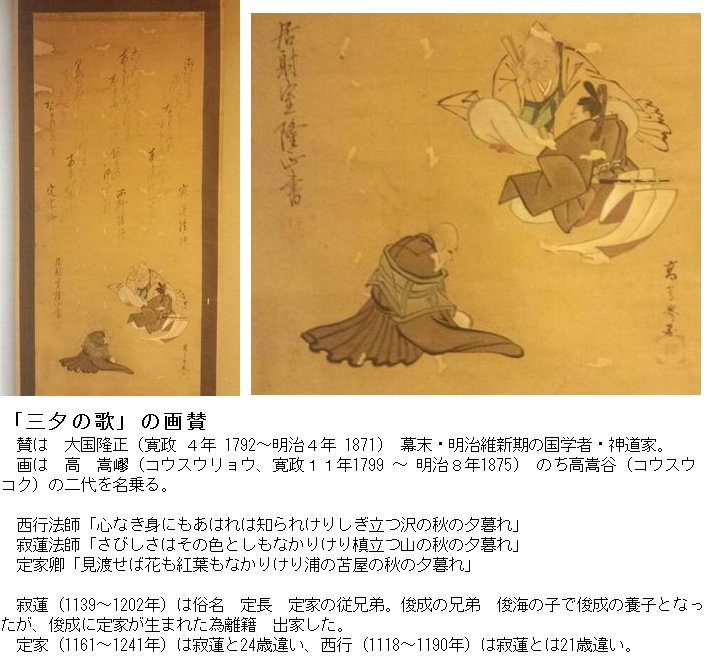 また寂蓮、藤原定家、藤原家隆、藤原雅経、藤原秀能などがすぐれた歌人である。寂蓮は歌を詠むことを決しておろそかにしなかった。あまりに歌を案じて心をくだいたために、かえって気宇の大きさなどについては極めて大きいというふうにはならなかったけれども、「それならば気宇の大きい、格調の高い歌を詠んでみよう」と思いたって、