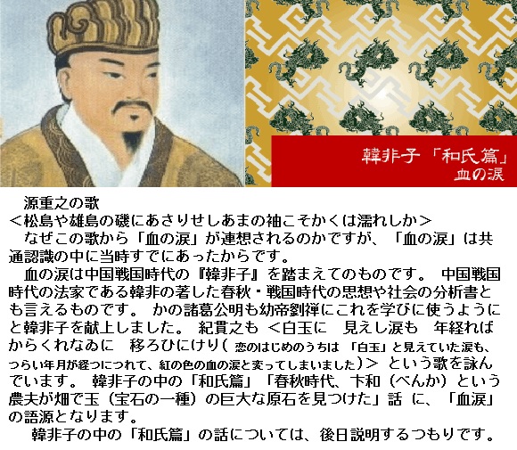 文王は之を聞いて、使者を遣わしてその理由を聞かせて曰く、 世間では足を切られる者は多いのに、どうしてそんなにも悲しむのか、と。 和氏が答えて曰く、 私は足を切られたことを悲しんでいるのではありません。 宝玉であるのに石とされ、忠貞の士であるのに君を欺く者とされた事を悲しんでいるのです、と。